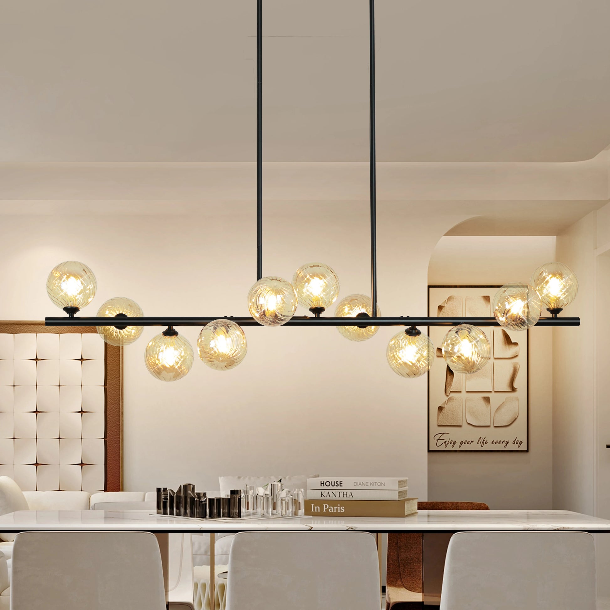 - In your dining room, this 11-light linear pendant in an iron finish creates a bold silhouette and delivers broad, even illumination for your table.